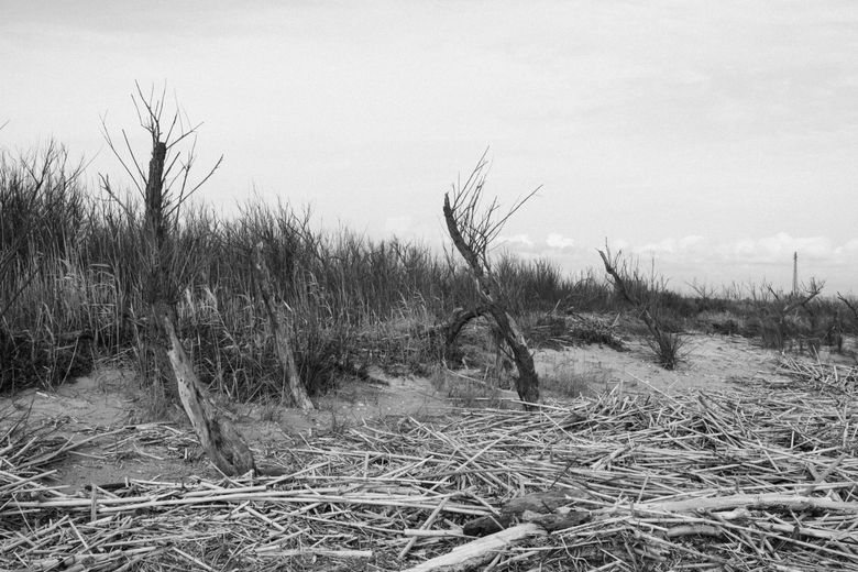 Houses, roads, and industrial structures persist as isolated presences, without a shared role.